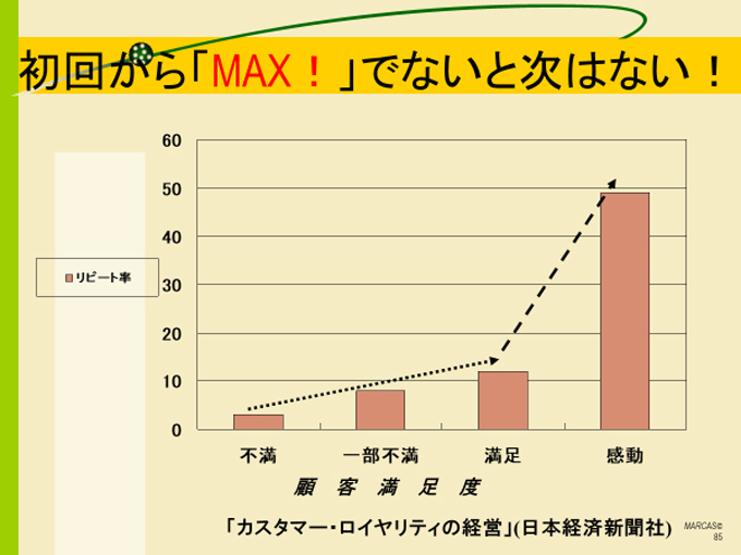 感動に評価が変わると、いきなりリピート率が劇的に跳ね上がります。初回から如何にマックスにしていくか、全ての企業の課題です。